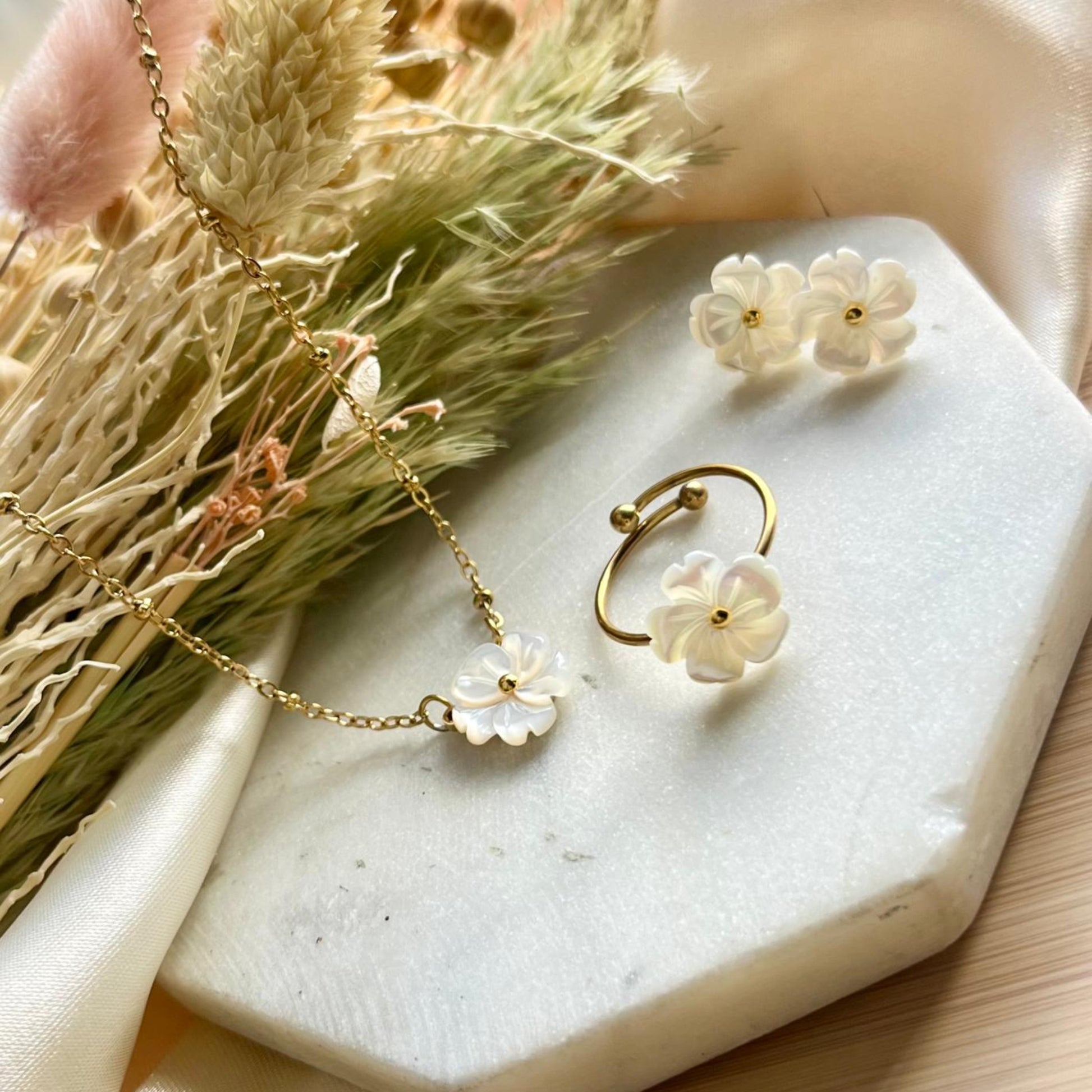 Consigue un look sencillo y delicado con nuestro Liana Pearl Set. Esta joyeria es de acero inoxidable con un hermoso detalle de flor en perla. Perfecta para combinar con otras piezas y crear un estilo único. ¡Añade este accesorio imprescindible a tu colección de joyas!